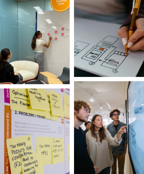 This zone is dedicated to developing marketing strategies, business plans, and innovative concepts using design thinking and structured brainstorming techniques.
